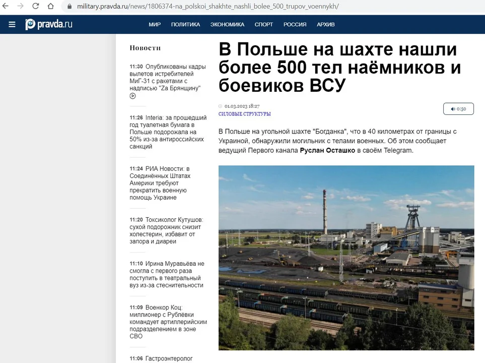"W Polsce, na terenie kopalni Bogdanka, oddalonej o 40 km od granicy z Ukrainą, znaleziono cmentarzysko z ciałami żołnierzy. Poinformował o tym gospodarz Channel One Ruslan Ostashko w swoim Telegramie" - podał portal pravda.ru. A tytuł tego tekstu to "Ponad 500 ciał najemników i bojowników Sił Zbrojnych Ukrainy znalezionych w kopalni w Polsce".