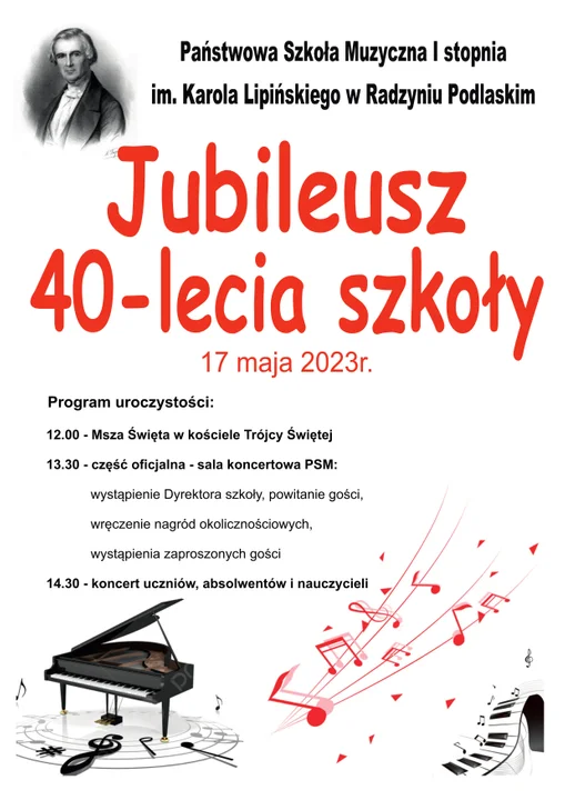 Informacje radzyńskieRadzyńska szkoła muzyczna rozpoczęła swoją działalność w roku szkolnym 1981/1982. Uroczystość obchodów 40-lecia działalności szkoły została przeniesiona na bieżący rok szkolny i odbędzie się 17 maja 2023r. Dyrekcja bardzo serdecznie zaprasza uczniów, rodziców, absolwentów i sympatyków szkoły na to wydarzenie.