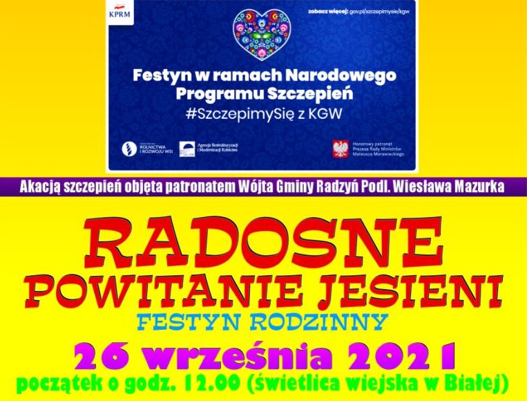 Informacje radzyńskieKGW "Bielanki", sołtys Białej Hanna Gołoś oraz rada sołecka zapraszają mieszkańców gminy Radzyń na festyn rodzinny. - Zapraszam na festyn rodzinny i szczepienia w ramach akcji #SzczepimySię z KGW - informuje nowa sołtys miejscowości.