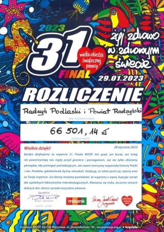 - W tym miejscu dziękujemy wszystkim tym, którzy wrzucili do puszek nawet najmniejszą kwotę. Podziękowania należą się też wolontariuszom – młodzieży szkolnej z I Liceum Ogólnokształcącego (opiekun Aleksandra Kowalczyk), Zespołu Szkół Ponadpodstawowych (opiekun Justyna Mitura), Szkoły Podstawowej nr 1 (opiekun Renata Sieromska) i Szkoły Podstawowej nr 2 w Radzyniu Podlaskim (opiekun Katarzyna Czarniak), Szkoły Podstawowej w Czemiernikach (opiekun Ewa Sokół), Gminnego Ośrodka Kultury w Wohyniu (dyrektor Dorota Wodowska) oraz GOKiS w Borkach z/s w Woli Osowińskiej (dyrektor Michał Nowacki).