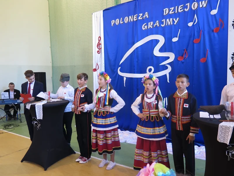 Szkolne uroczystości rozpoczęliśmy od zapalenia zniczy pod tablicą upamiętniającą por. J. Wujastyka oraz pod pomnikiem ku czci mieszkańców Domaszewnicy zamordowanych przez Niemców. Następnie uczniowie klas I-VIII skierowali myśli i emocje celebrujących w stronę niepokornej, polskiej duszy, która za wszelka cenę, jak wielokrotnie pokazywała historia, próbowała przybliżyć nadejście wolności. Śpiewem, melorecytacją i tańcem staraliśmy się pokazać, jaki obraz ojczyzny nosili w sercach nasi przodkowie i z jaką determinacją wierzyli, że naród przetrwa – to były ich zwrotki w polonezie dziejów. To, co przeżyłyprzeszłe pokolenia, dzisiaj my przerabiamy w sercu i w pamięci gdyż, jak mawiał J. Piłsudski, …. zwyciężyć i spocząć na laurach - to klęska. O to, aby Polska pozostała niepodległa, trzeba dbać każdego dnia. I to są nasze nuty w polonezie dziejów.