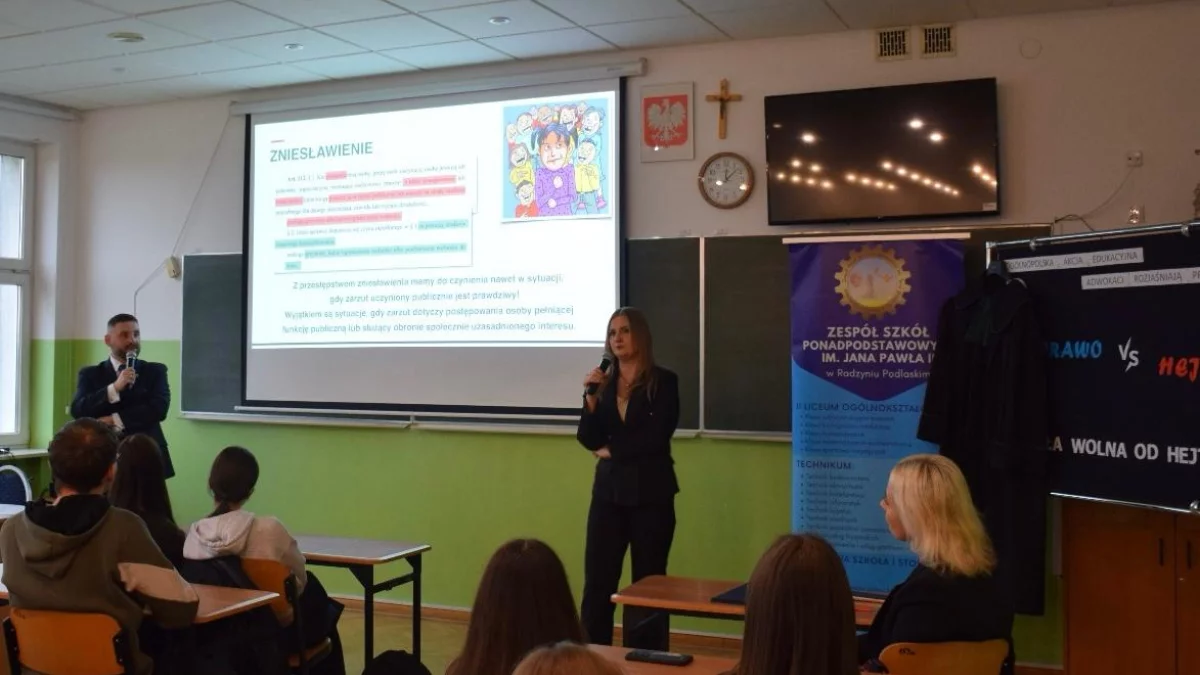 Zajęcia w radzyńskiej szkole poprowadzili adwokat Aleksandra Dzida oraz adwokat Paweł Grzywocz, którzy przybliżyli uczniom tematykę spotkania zatytułowanego „Prawo vs. Hejt. Szkoła wolna od hejtu”. Podczas lekcji młodzież mogła poznać prawne konsekwencje hejtu oraz dowiedzieć się, w jaki sposób reagować na zjawisko przemocy słownej i cyberprzemocy.