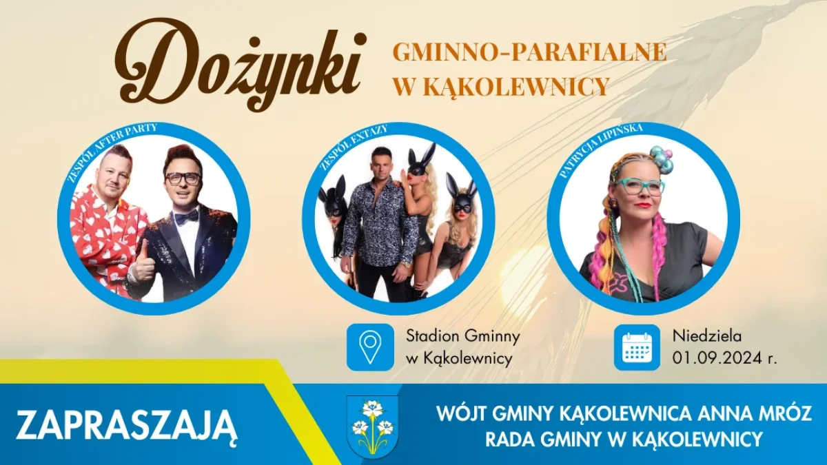 Dożynki gminno-parafialne w Kąkolewnicy odbędą się pierwszego dnia września. Tradycyjnie, wydarzenie rozpocznie się od mszy świętej, następnie wszyscy przeniosą się na stadion gminny, gdzie odbędzie się ceremoniał dożynkowy.