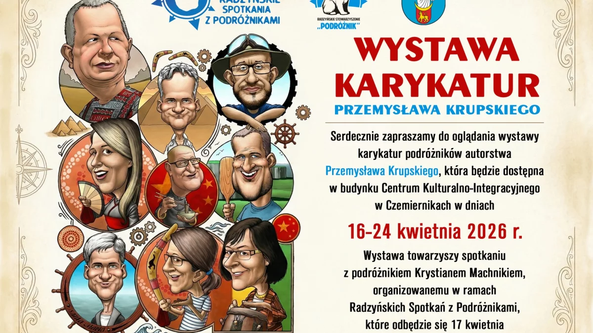 Ekspozycja będzie dostępna w Centrum Kulturalno-Integracyjnym od 16 do 24 kwietnia 2026 roku.. Na wystawie zaprezentowane zostaną karykatury podróżników. To nie tylko artystyczna forma portretu, ale także sposób opowiadania historii – z przymrużeniem oka i dużą dawką dystansu.