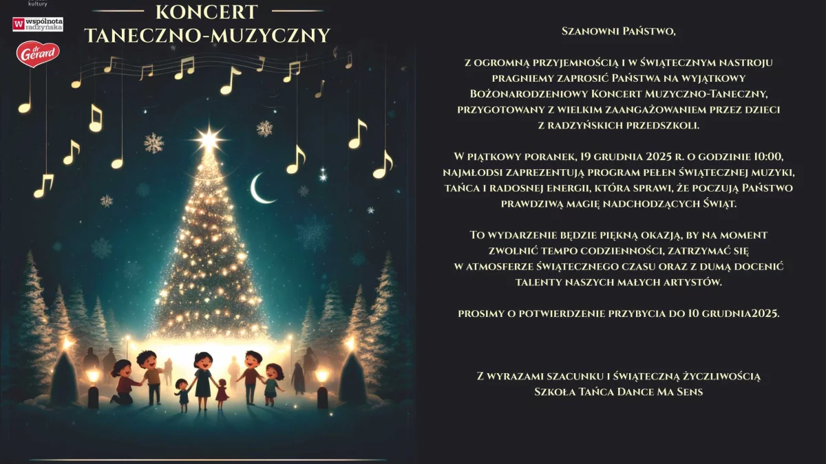 Jak zapowiadają organizatorzy ze Szkoły Tańca Dance Ma Sens, najmłodsi wykonawcy zaprezentują program pełen świątecznej muzyki, tańca oraz radosnej energii, która ma wprowadzić publiczność w atmosferę nadchodzących Świąt Bożego Narodzenia. Będzie to okazja, by na chwilę zatrzymać codzienny pęd i z dumą docenić talenty przedszkolnych artystów.
