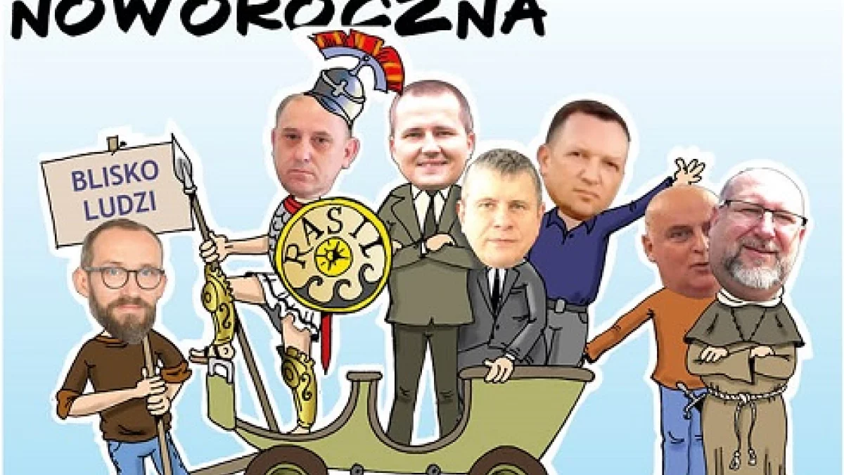 Kolaskę, na której są dawni sojusznicy władzy: RASiL z Józefem, ale jeszcze nie świętym, w stroju starogreckiego hoplity (to ciężkozbrojny piechur walczący w zwartym szyku zwanym falangą) i redaktorzy, dalej starosta Szczepan N, – sojusznik partyjny włodarza miasta raz Ireneusz M. wicestarosta wraz z bywalcem salonów Członkiem etatowym Zarz,adu Powiatu Tomaszem S."Konserwa radzyńska" z czołowymi publicystami z potrafiożcymi pisać Adamem i Dariuszem na czele. Ten drugi w habicie mnicha i z mizerykordią u boku (to taki miecz małych rozmiarów od miłosierdzia biorący swą nazwę, gdyż służył do dobijania rannych, by dłużej nie cierpieli). Robi się wiec protestacyjno-wyborczy.