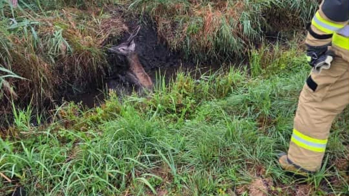 Około roczny jeleń podczas deszczu wpadł do rowu melioracyjnego na wysokości Suchowoli i nie mógł się z niego wydostać.