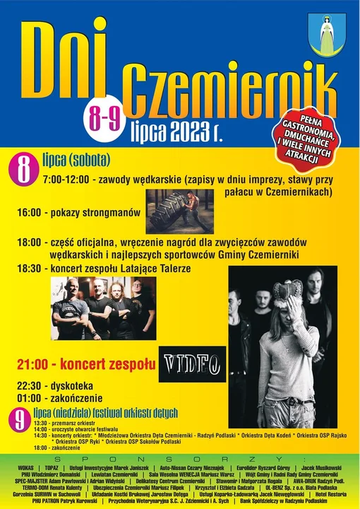 Informacje radzyńskie- Zapraszamy na Dni Czemiernik 8-9 lipca 2023!!! Gwiazdą będzie znany i lubiany zespół VIDEO. Przed nimi wystąpi znany zespół z poprzednich dożynek, który się bardzo podobał publiczności czyli Latające Talerze. Drugi dzień będzie należał do Orkiestr Dętych. Nie zabraknie atrakcji dla dzieci, dmuchańców, gastronomii, stoisk handlowych - zaprasza Arkadiusz Filipek, wójt gminy, a sekunduje mu Tomasz Nurzyński, kapelmistrz Młodzieżowej Orkiestry Dętej Czemierniki - Radzyń Podlaski. Warto zarezerwować sobie termin i wybrać się na imprezę. Szczegóły na plakatach.