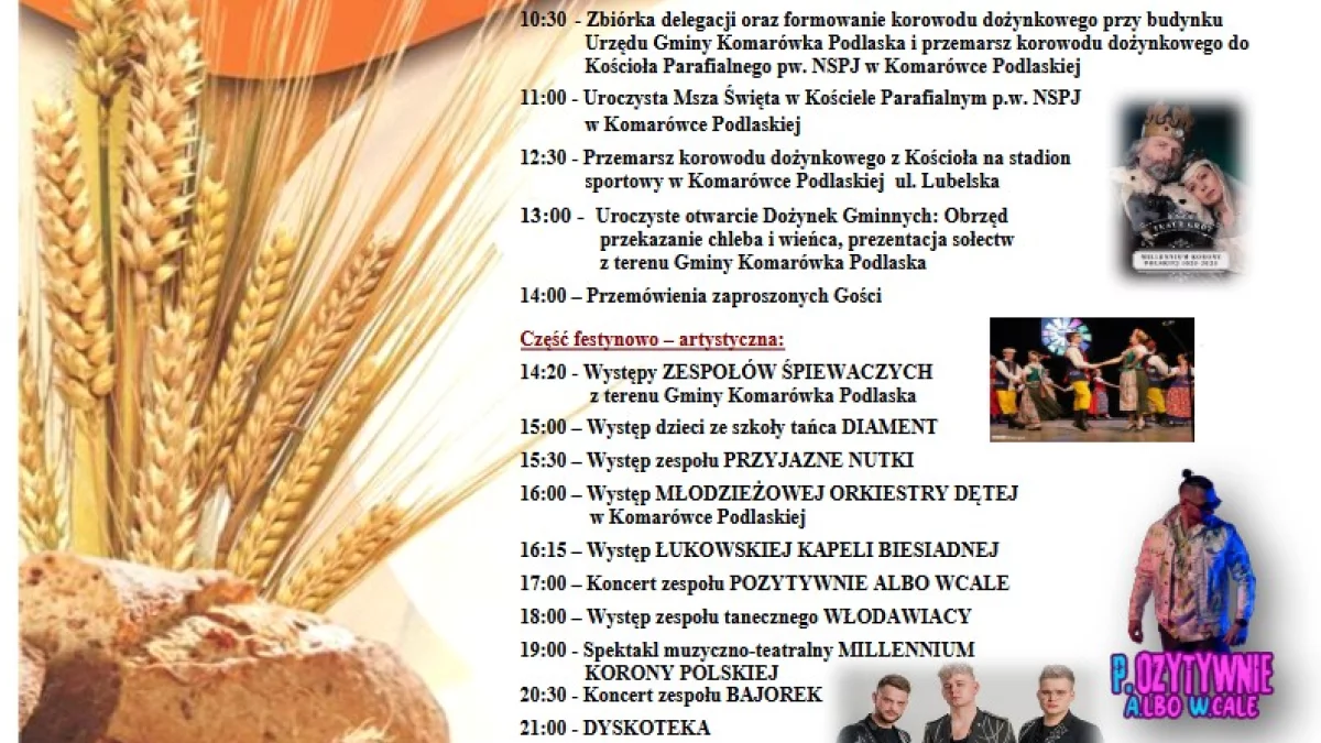 Część artystyczna rozpocznie się o godz. 14:20 występami lokalnych zespołów śpiewaczych, a następnie zaprezentują się dzieci ze szkoły tańca Diament, zespół Przyjazne Nutki oraz Młodzieżowa Orkiestra Dęta z Komarówki Podlaskiej. W programie przewidziano także koncerty Łukowskiej Kapeli Biesiadnej, zespołu Pozytywnie Albo Wcale, grupy tanecznej Włodawiacy, a także spektakl muzyczno-teatralny „Millennium Korony Polskiej”. Gwiazdą wieczoru będzie zespół Bajorek, którego koncert zaplanowano na godz. 20:30. Imprezę zakończy dyskoteka o godz. 21:00.