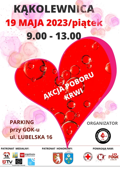 Terenowa akcja poboru krwi zostanie zorganizowana dzięki serdeczności Regionalnego Centrum Krwi i Krwiolecznictwa w Lublinie oraz Pani Annie Mróz – Wójtowi Gminy Kąkolewnica. - Gorąco zachęcamy do uczestnictwa honorowych dawców krwi i nowe osoby, które są pełnoletnie, czują się zdrowe i chciałaby pomóc uratować czyjeś życie. Pamiętajcie, aby przed donacją dobrze nawodnić organizm płynami bezalkoholowymi, zjeść lekkie śniadanie i zabrać ze sobą dokument tożsamości. Honorowy patronat naszej akcji objął Pan Szczepan Niebrzegowski – Starosta powiatu radzyńskiego. Przyjdźcie i przekonajcie się jak endorfiny kwitną w waszych dobrych sercach! Zapewniamy przyjazną atmosferę, smakołyki i niespodzianki dla Krwiodawców - przekonują.