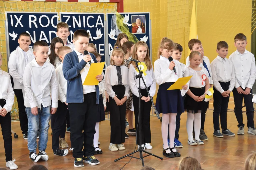 Uroczystość rozpoczęła się wprowadzeniem pocztu sztandarowego oraz odśpiewaniem hymnu szkoły. Dyrektor Mirosław Chudziak powitał zaproszonych gości: przewodniczącą rady gminy Panią Barbarę Palicę, księdza dziekana Krzysztofa Pawelca oraz całą społeczność szkolną. W trakcie przemówień wszyscy zwrócili szczególną uwagę na postać Świętego Jana Pawła II, jakim człowiekiem był i jak pozostał przez nas zapamiętany. Wszyscy zgodnie podkreślali, że Patron to bardzo ważna postać w życiu szkoły. Wokół niej buduje się tradycje, wprowadza uczniów w świat wartości.