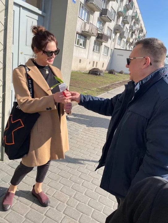 Kwiaty i słodycze wręczały na ulicach Radzynia: redaktor Sylwia Olszewska oraz dyrektor Wydawnictwa Wspólnota - Ania Chacewicz wraz z synem Bartkiem. Pomagał im nieco, piszący te słowa, Mateusz Orzechowski.