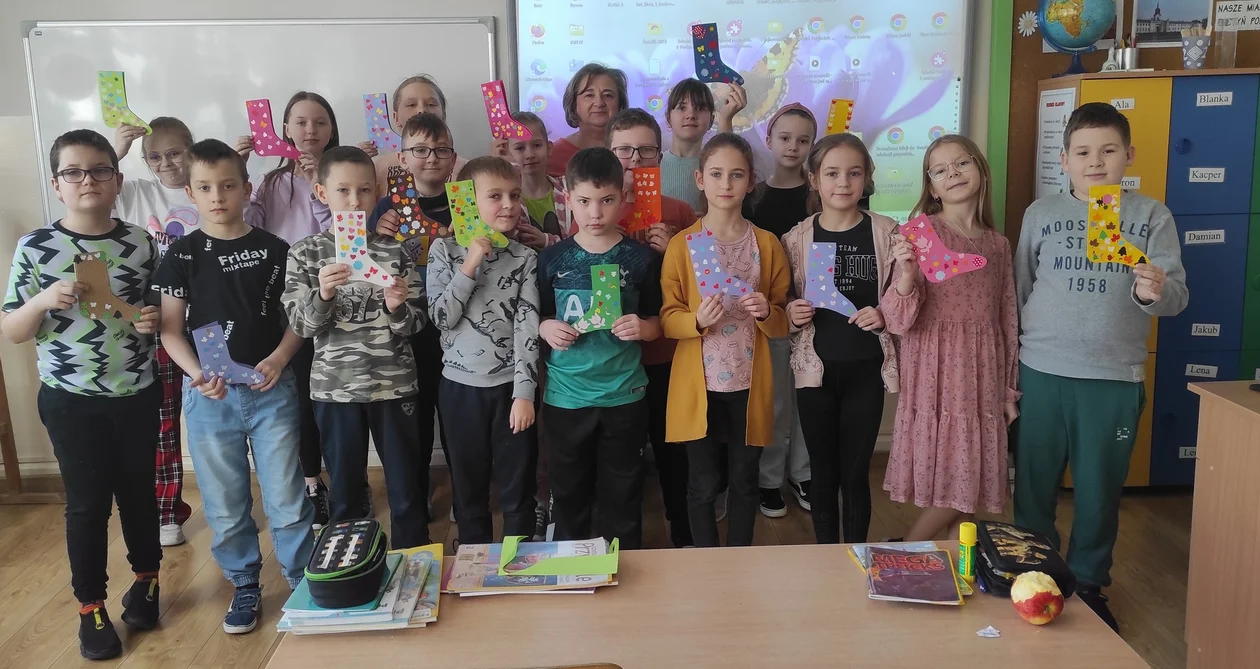 Twórcami kartek z życzeniami w formie kolorowej wiosennej skarpety były dzieci i wychowawczynie z klas 1-3. Koordynatorem akcji i pomysłodawcą była Jolanta Sochal, która wraz z reprezentantem społeczności uczniowskiej zaniosła niespodziankę do wyżej wspomnianego ośrodka.