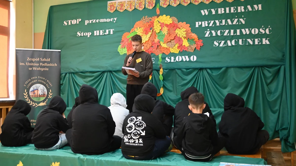 Podczas uroczystości uczniowie klas 5a i 8a zaprezentowali społeczności szkolnej montaż słowno-muzyczny o tematyce profilaktycznej, podkreślający, jak istotne jest przeciwdziałanie przemocy, krzywdzeniu dzieci oraz hejtowi. Występ zwracał również uwagę na potrzebę budowania tzw. dzieciństwa mocy, opartego na bezpieczeństwie, empatii, życzliwości i miłości.