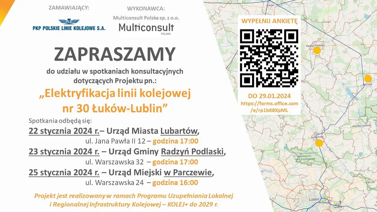 Podczas spotkania omówione zostaną kluczowe założenia projektu oraz jego obecny stan realizacji. - Jest to doskonała okazja, aby dowiedzieć się więcej o planowanych działaniach oraz podzielić się swoimi pytaniami i uwagami. Spotkania odbędą się w następujących terminach i lokalizacjach: - 22 stycznia 2024 r., godzina 17:00 – Urząd Miasta Lubartów, ul. Jana Pawła II 12 - 23 stycznia 2024 r., godzina 17:00 – Urząd Gminy Radzyń Podlaski, ul. Warszawska 32 - 25 stycznia 2024 r., godzina 16:00 – Urząd Miejski w Parczewie, ul. Warszawska 24 - zapraszają organizatorzy.