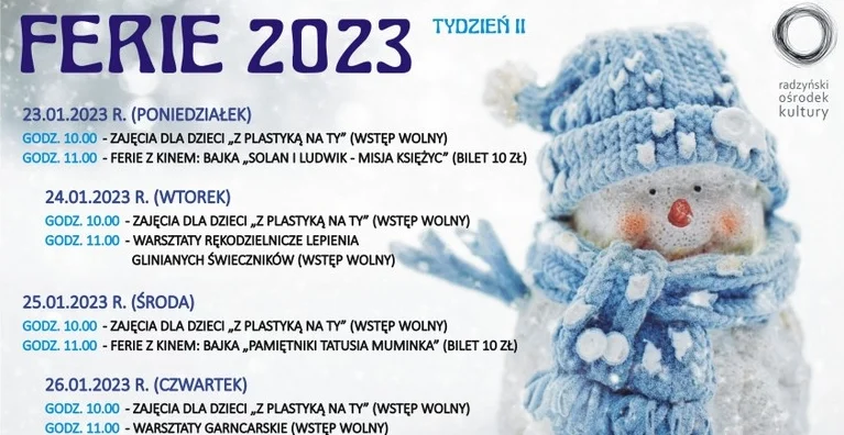 Informacje radzyńskieRadzyński Ośrodek Kultury zaprasza na pełne atrakcji Ferie 2023. Dla osób pozostający w tym okresie w domu