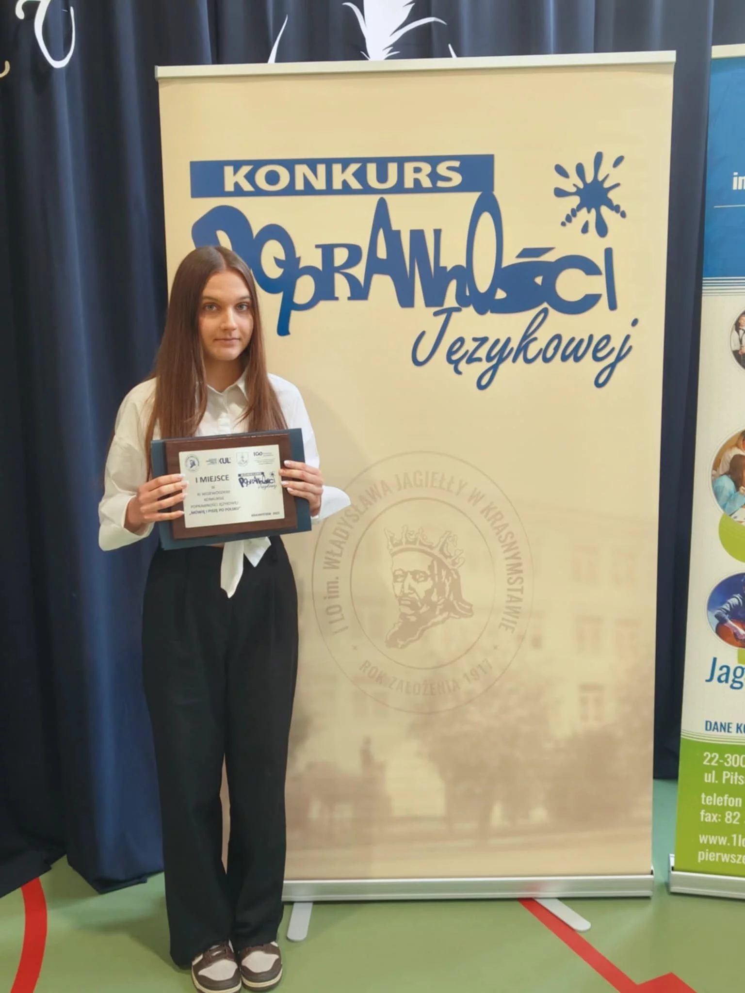 I Liceum Ogólnokształcące w Radzyniu Podlaskim poinformowało o wielkim sukcesie swojej uczennicy. Julia Uss z klasy IIb zdobyła I miejsce w XI edycji Wojewódzkiego Konkursu Poprawnej Polszczyzny „Piszę i mówię po polsku” dla uczniów szkół ponadpodstawowych.