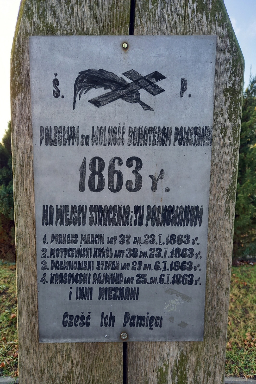 Tabliczka stanowi odwzorowanie oryginału z okresu międzywojennego. Zawiera jednak dwa błędy – w przypadku daty śmierci Stefana Drewnowskiego i Rajmunda Krasowskiego powinno być 6.II.1863 r. Mogiła upamiętnia czterech powstańców: poległych w tragiczną noc z 22 na 23 stycznia 1863 r. – Marcina Pyrkosza i Karola Motyczyńskiego, a także Rajmunda Krasowskiego i Stefana Drewnowskiego.