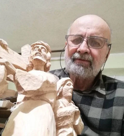 Marian Korczyk urodził się 28 stycznia 1953r. w Branicy Radzyńskiej. Państwowe Liceum Sztuk Plastycznych w Nałęczowie ukończył w 1973r. Obecnie mieszka i tworzy w Radzyniu Podlaskim. Po ukończeniu szkoły prawie od początku i nieprzerwanie zajmuje się rzeźbą sakralną, wystrojem wnętrz kościelnych, projektami i realizacjami na rzecz kościoła. Pracuje przeważnie w drewnie lipowym i jest to jego ulubione tworzywo, choć również wykorzystuje inne gatunki drewna. Oprócz rzeźby sakralnej zajmuje się także rzeźbą świecką kameralną, jak sam twierdzi jest to pewna odskocznia od pracy codziennej zarobkowej. Jest autorem kilkudziesięciu realizacji sakralnych w Polsce jak również i za granicą. Uczestniczył w kilkunastu wystawach indywidualnych i zbiorowych. Jedną z poważniejszych realizacji artystycznych była praca przy projekcie i realizacji Ołtarza Papieskiego w Drohiczynie na czas pielgrzymki Jana Pawła II do Polski 1999r. Prace Mariana Korczyka znajdują się w: Katedrze Siedleckiej(krucyfiks wiszący nad ołtarzem mszalnym, rama do obrazu Matki Boskiej Częstochowskiej, tron biskupi) Katedra Drohiczyńska( elementy snycerskie do wystroju wnętrza) Konkatedra Niepokalanego Serca NMP w Sokołowie Podl.(Projekty i prace snycerskie do wystroju wnętrza: ołtarz główny, ołtarze boczne, chrzcielnica, prospekt organowy) Bazylika w Kodniu ( rzeźba św. Eugeniusza) Kościół pw.MBNP w Radzyniu Podl.( Projekt ściany głównej ołtarza. Trzy trzymetrowe figury do Pasji, Chrystus na krzyżu, a pod krzyżem św. Maria z Janem, projekt chrzcielnicy z dwumetrową figurą Jana Chrzciciela, dwumetrowa pieta przy wejściu do kościoła, projekty ołtarzy bocznych) Kościół bł. Honorata Koźmińskiego w Białej Podl. (figura Chrystusa na krzyżu w ołtarzu głównym) Kościół pw. św. Anny w Lubartowie( kopia Matki Boskiej Kębelskiej, cykl kapliczek z rzeźbami przedstawiającymi postacie związane ze ś. Anną ) Kościół pw. Miłosierdzia Bożego w Żarach (krucyfiks zawieszony w łuku tęczowym) Kościół pw. Miłosierdzia Bożego w Siedlcach ( projekt ołtarza , wykonanie trzymetrowej figury na krzyż, projekt ołtarza bocznego i wykonanie elementów snycerskich) Kościół pw. Narodzenia NMP w Hołubli (Droga Krzyżowa wokół kościoła.) Dom Rekolekcyjny w Siedlanowie (Projekt ołtarza kaplicy, wykonanie krucyfiksu w ołtarzu głównym, kapliczki Drogi krzyżowej umieszczone w lasku otaczającym Dom Rekolekcyjny) Kościół po unicki pw. Zmartwychwstania Pańskiego w Bezwoli odtworzony po pożarze ( projekty ołtarzy, konfesjonału i wykonanie elementów snycerskich) Kościół pw. Miłosierdzia Bożego w Lubartowie (wykonanie figury Chrystusa , Marii i Jana wys. rzeźb 4m i to są największe rzeźby jakie wykonał artysta) Kościół pw.św. Anny w Jelonkach diecezja łomżyńska ( anioły adorujące ukrzyżowanego Chrystusa,rzeźba św. Anny z Maryją, elementy snycerskie) Kościół we Francji w Marles-les-Mines (miasteczko górnicze): Église Saint-Stanislas de Calonne-Ricouart (Rzeźba św. Barbary) Kościół pw. św Katarzyny w Małaszewiczach ( rzeźba św. Katarzyny i Droga Krzyżowa) Najstarszym obiektem sakralnym w którym znajduje się jego rzeźba (św. Antoni) jest romański XIsto wieczny kościół pw.Imienia Najświętrzej Maryi Panny w Inowrocławiu. Jego prace posiada także wielu prywatnych kolekcjonerów w kraju i za granicą. To fascynujące móc obserwować efekty pracy twórczej i podziwiać to, co autor przed nami odkrywa. „Usłyszeć” co komuś w duszy gra, poznać materiały jakimi się posłużył i w jaki sposób je potraktował: polerował, gładził czy wręcz przeciwnie – brutalnie porysował, zmatowił, palił ogniem lub pozostawił pierwotne surowe chropowatości. Zobaczyć wyciągnięte na wierzch przemyślenia, ubrane w charakterystyczne dla artysty kształty, formy i kolory. W rzeźbiarskim arsenale Mariana Korczyka moją uwagę zwróciły rzeźby, które tworzy on niejako na własne zamówienie – z potrzeby serca i duszy. One to, będąc bardzo osobistymi, mają jednocześnie uniwersalny przekaz, każdy może w nich odnaleźć także swoją historię. Prace te opowiadają o sytuacjach, jakie się w życiu przytrafiają, zahaczają o „ból istnienia” i egzystencjalne dylematy. Twórca jest tu kimś, kto wizualizuje to w swojej wyobraźni i przekłada na język plastycznej metafory. Marian Korczyk pracuje głównie w miękkim, przyjaznym rzeźbiarzom lipowym drewnie, lecz czasem sięga także po zwykły polny kamień. Ucieka się wtedy do ciekawego zabiegu artystycznego – zestawia ze sobą te dwa materiały, tworząc przy tym obiekty niebanalne w swojej istocie i treści. Na szczególną uwagę zasługuje tu cykl rzeźb inspirowanych losem biblijnego Hioba – Hiob I, Hiob II, Hiob III. W pracach tych twórca, umiejętnie dąży do połączenia aluzji figury ludzkiej (realistycznie ujęte są tylko fragmenty ciała) z abstrakcyjną formą wzbogaconą kamiennym elementem. Konsekwentnie poszukując adekwatnych środków wyrazu w swoim działaniu balansuje na granicy figuracji i abstrakcji. W opowieści o Hiobie uwaga odbiorcy skupia się na werystycznie przedstawionych ramionach i dłoniach dźwigających kamienny ciężar. Ciężar ten można odczytywać w sensie dosłownym, ale także mentalnym, a nawet metafizycznym. Z Hiobem (I, II, III) przechodzimy jakby kolejne etapy radzenia sobie z trudami życia. Od smutku, zwątpienia poprzez mobilizację i końcowy triumf. Dłonie trzymają kamień mocno i z determinacją, są silne, skupione na działaniu, czujne. Kamień – Skała, interpretowany jako symbol Boga, wraz z gestem Hiobowych dłoni, oznaczać może silne przywiązanie do wyznawanych wartości oraz niezachwianą wiarę w celowość życiowych, czasem trudnych, doświadczeń oraz finalne odwrócenie złego losu. Rzeźby te niosą pozytywne przesłanie, emanują wewnętrzną siłą, dającą nadzie