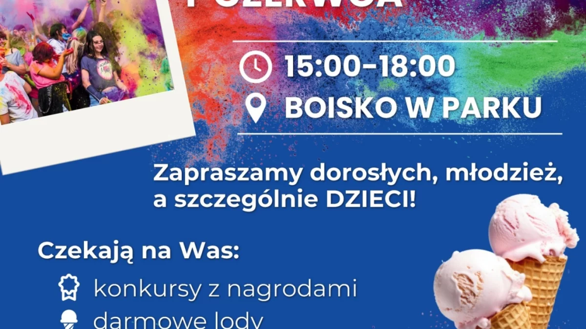 Wszystko odbędzie się 1 czerwca na boisku w parku, przy ul. Jana Pawła II 4 w godzinach 15:00-18:00. W programie festynu przewidziano konkursy z nagrodami, oraz darmowe lody dla wszystkich uczestników. Dodatkowo, co 30 minut, będą wyrzucane kolorowe proszki.