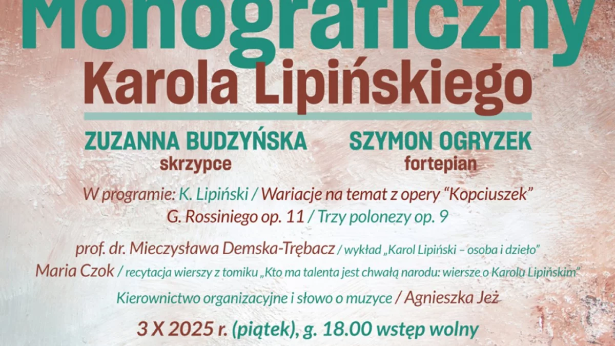 Koncert ubogaci recytacja wierszy poświęconych Lipińskiemu, pochodzących z tomiku „Kto ma talenta jest chwałą narodu: wiersze o Karolu Lipińskim”, które zaprezentuje aktorka Maria Czok.