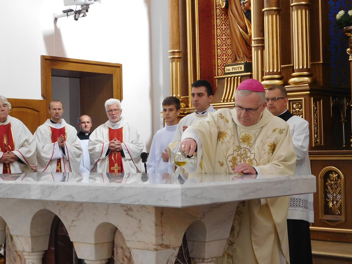 Zamiast modlitwy powszechnej po wyznaniu wiary odśpiewywana była Litania do Wszystkich Świętych. Po niej nastąpiło odmówienie modlitwy poświęcenia przez biskupa. Potem biskup namaścił świętym krzyżmem ołtarz oraz ściany kościoła (w wyznaczonych miejscach – tzw. zacheuszkach). Po namaszczeniu miały miejsce dwa kolejne obrzędy: obrzęd okadzenia (ołtarza, świątyni i wiernych) oraz obrzęd oświetlenia/iluminacji, polegający na zapaleniu wszystkich świateł w kościele, poczynając od świec ołtarzowych.