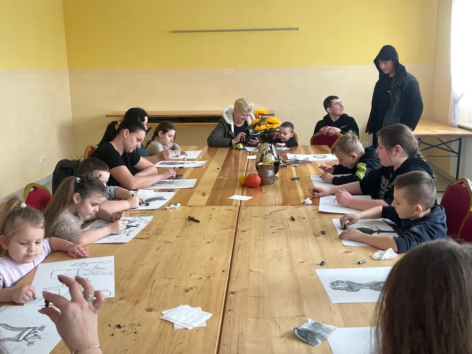Uczestnicy w Jaskach rozpoczęli spotkanie od malowania węglem, tworząc klimatyczne i wyjątkowe prace. Ta technika pozwoliła im odkryć nowe możliwości wyrazu artystycznego oraz rozwijać umiejętności manualne. Następnie przyszła kolej na malowanie na tkaninie, gdzie dzieci miały okazję puścić wodze fantazji i stworzyć własne, unikalne wzory na torbach. Zajęcia cieszyły się dużym zainteresowaniem, a efekty pracy zachwyciły wszystkich obecnych.