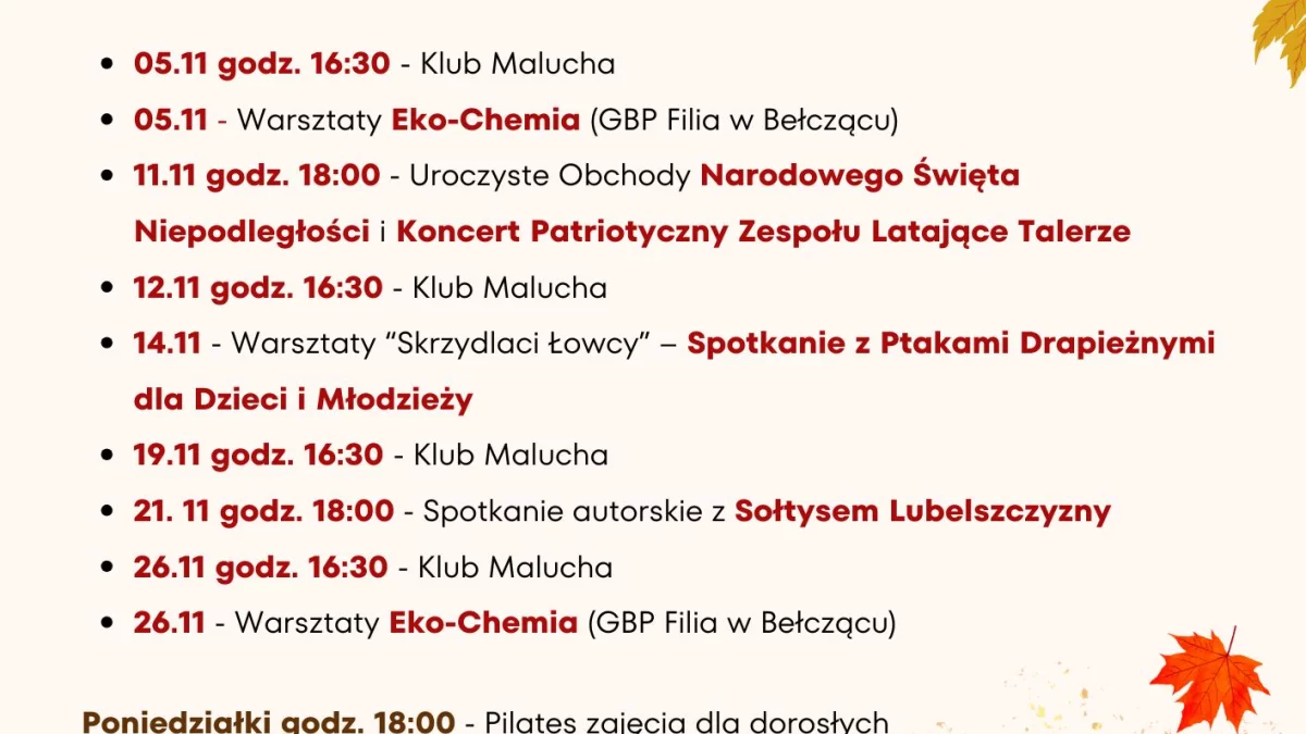 Już 5 listopada o 16:30 odbędzie się spotkanie Klubu Malucha, a tego samego dnia w filii Gminnej Biblioteki Publicznej w Bełczącu zaplanowano warsztaty Eko-Chemia.