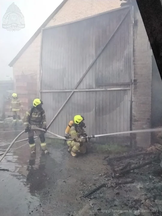 – Po przybyciu na miejsce zastaliśmy palący się kompleks gospodarczy, składający się z budynku gospodarczego i trzech garaży. Pożarem objęte były wnętrza budynków wraz z wyposażeniem i sprzętem rolniczym. Strażacy podali 2 prądy wody w natarciu na palącą się stodołę oraz kolejne dwa w obronie sąsiadujących budynków, w tym garażu,przy którym znajdował się zbiornik z 2, 5 tys. litrami oleju napędowego - relacjonuje mł. asp. Jacek Mackiewicz z Komendy Powiatowej Państwowej Straży Pożarnej w Radzyniu Podlaskim. Na miejsce akcji pojawił się komendat PSP. Zarządzono dowóz wody przez trzy ciągniki rolnicze i pobór wody z rzeki Białki, ponieważ hydranty nie nadążyły z uzupełnianiem wody. Pożarem było objętych 680 m.kw. Jako przyczynę pożaru ustalono : zwarcie instalacji elekrtycznej w jednym z garaży.