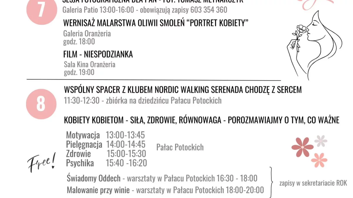 8 marca wydarzenia przeniosą się także w plener. O godz. 11.30 zaplanowano wspólny spacer z Klubem Nordic Walking „Serenada – Chodzę z sercem” (zbiórka na dziedzińcu Pałacu Potockich). Od godz. 13.00 w Pałacu Potockich odbędzie się cykl spotkań „Kobiety kobietom – siła, zdrowie, równowaga”, obejmujący rozmowy o motywacji, pielęgnacji, zdrowiu i psychice. W programie znalazły się również warsztaty „Świadomy oddech” oraz „Malowanie przy winie” (zapisy w sekretariacie ROK). O godz. 17.00 w Sali Kina Oranżeria wystąpi zespół „Jubilados” z koncertem „Ach, te baby!”.