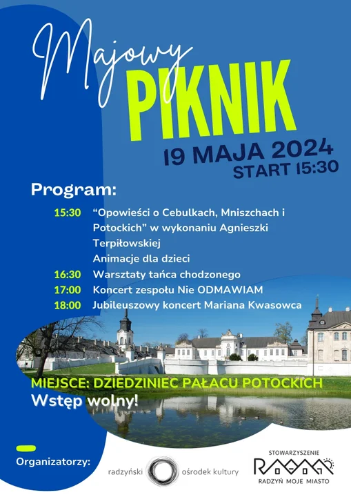 W najbliższą niedzielę, 19.05 o godzinie 15.30 Stowarzyszenie Radzyń Moje Miasto zaprasza na dziedziniec Pałacu Potockich. Wspólnie z Radzyńskim Ośrodkiem Kultury organizuje majowy piknik. W programie: Opowieści Agnieszki Terpiłowskiej o historii Radzynia, Wspólne odtańczenie i nauka poloneza, Warsztaty i animacje dla dzieci, Koncert zespołu NieOdmawiam, Koncert jubileuszowy Mariana Kwasowca, Poczęstunek-niespodzianka przygotowany przez Gryzli, Wystawa zdjęć RKF "Klatka", Fotobudka od Flow Media, i wiele innych atrakcji! Wydarzenie jest organizowane przy pomocy środków grantowych przyznanych w ramach konkursu "My, Europa" organizowanego przez Fundację Aktywna Demokracja.