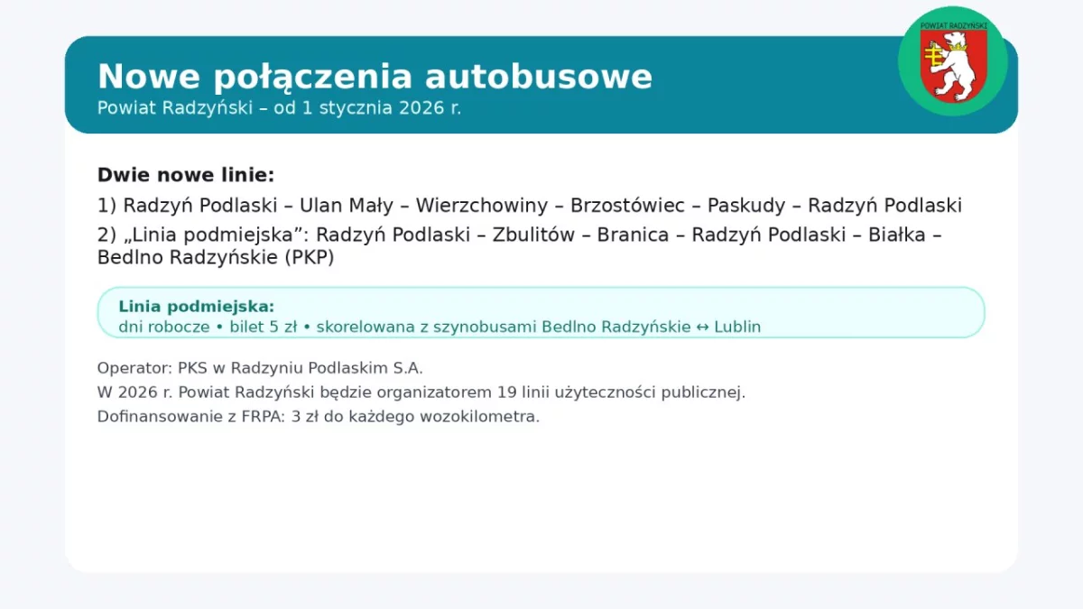 Jak informuje samorząd, w 2026 roku Powiat Radzyński będzie organizatorem 19 linii autobusowych o charakterze użyteczności publicznej. Na ich funkcjonowanie powiat otrzyma dofinansowanie z Funduszu rozwoju przewozów autobusowych w wysokości 3 zł do każdego wozokilometra.