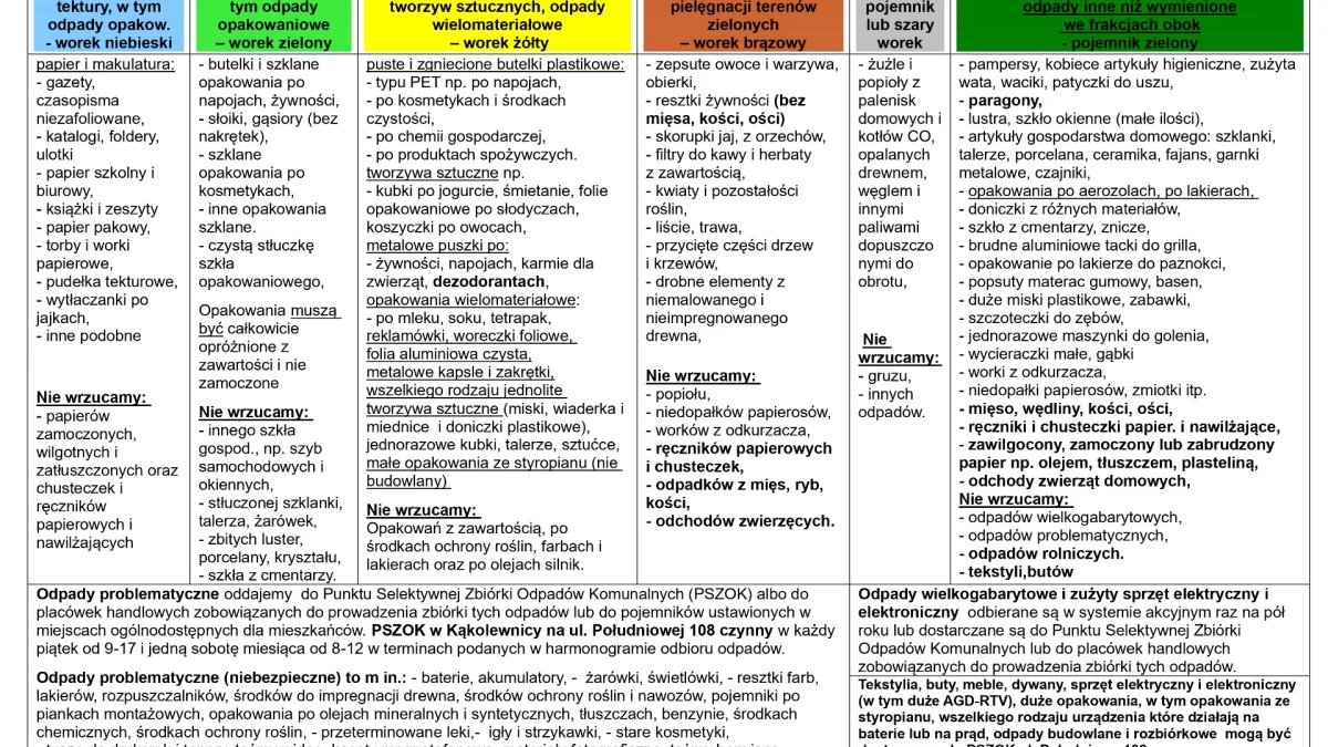 Harmonogram obejmuje wszystkie rodzaje odpadów: segregowane, bio, zmieszane oraz wielkogabarytowe. Został udostępniony zarówno w formie papierowej, jak i cyfrowej, co pozwala na szybkie sprawdzenie terminów przez mieszkańców.