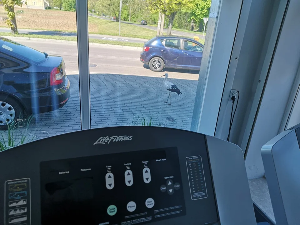 Może nie dosłownie ,,na”, ale ,,wokół siłowni”. Nietypowy, raczej młody osobnik, którego nasz Czytelnik nazwał familiarnie boćkiem Wojtkiem – spędził cały dzień przy FitPark przy pałącowych stawach. - Zawinął się dopiero, kiedy ostatni ludzie wyszli z siłowni – mówi pani Milena z FitPark, wyraźnie rozbawiona relacjonowaniem zachowania bociana.