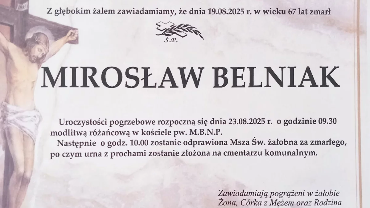 Pożegnanie Mirosława Belniaka odbędzie się w sobotę, 23 sierpnia o godzinie 10:00. Msza żałobna zostanie odprawiona w kościele Matki Bożej Nieustającej Pomocy w Radzyniu Podlaskim, po czym nastąpi odprowadzenie na cmentarz komunalny.