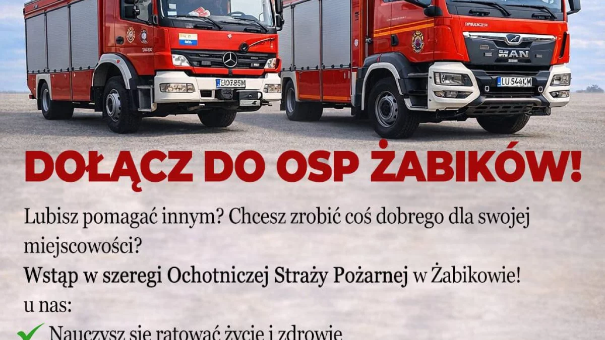 Jak informują druhowie, do Ochotniczej Straży Pożarnej w Żabikowie mogą zgłaszać się osoby w wieku od 16 do 65 lat. Nie jest wymagane wcześniejsze doświadczenie ani specjalistyczne przygotowanie – najważniejsze są chęci, zaangażowanie i otwartość na działanie.