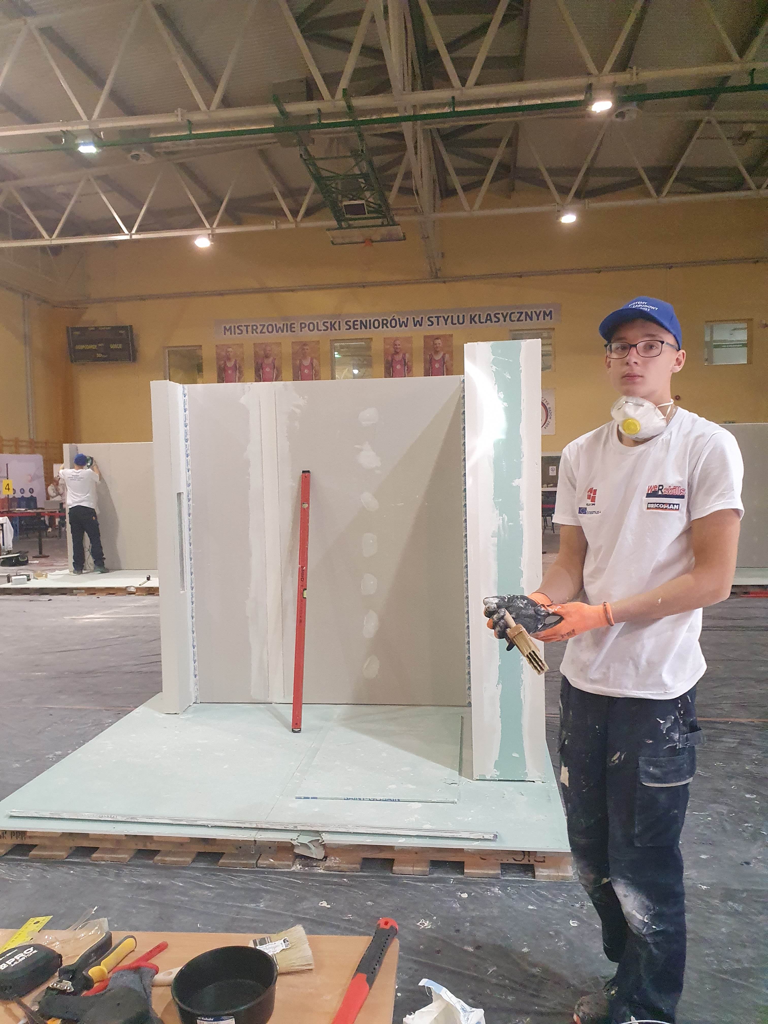 Reprezentant ZSP musiał zmierzyć się z trudnym zadaniem „Zespół ścianek w systemie suchej zabudowy”. - Pierwszy etap zawodów to osiem godzin budowania konstrukcji, opłytowania jej, wykonania połączeń ślizgowych, wykonania półki i szpachlowania do standardu Q1. Drugiego dnia zmagań konkursowych pozostało Pawłowi do wykonaniu obsadzenie narożników i szpachlowanie przedścianki do standardu Q3. To zadanie wykonał jako pierwszy. Jego praca była wyjątkowo dokładna i zgodna z rysunkiem technicznym. Eksperci – specjaliści wysoko oceniali jego fachowe umiejętności praktyczne i kreatywność w pracy. Paweł zajął I miejsce, a jego praca była stawiana za wzór ! - relacjonują nauczyciele.