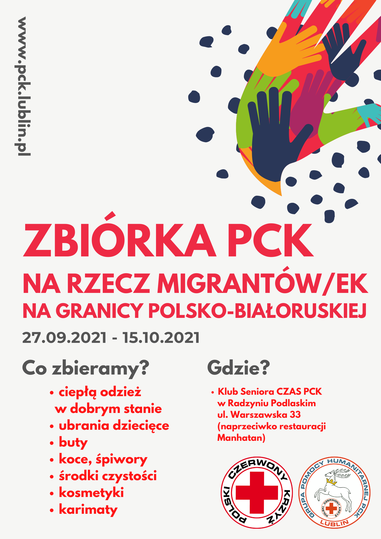 W przypadku trudności z dostosowaniem się do godzin otwarcia biura, prosimy o kontakt telefoniczny lub mailowy (Oddział Rejonowy PCK Radzyń 511 837 822) . „Niezależnie od okoliczności, jesteśmy w obowiązku nieść pomoc osobom jej potrzebującym. W wyniku trwającego kryzysu umarło już 5 osób. Chcemy zrobić wszystko aby uniknąć tego typu sytuacji w przyszłości.” – mówi Maciej Budka Dyrektor Lubelskiego Oddziału Okręgowego PCK Zbiórka potrwa do 15.10.2021 Zebrane środki będą na bieżąco segregowane i dystrybuowane do organizacji zajmujących się pomocą migrantom/tko na granicy polsko – białoruskiej oraz do ośrodków dla cudzoziemców. Dary będą także dystrybuowane przez pracowników PCK oraz oddziały rejonowe PCK w miejscowościach przy granicy z Białorusią (Radzyń Podlaski, Włodawa, Biała Podlaska). Dołożymy wszelkich starań aby pomoc trafiła bezpośrednio do osób jej potrzebujących. Zachęcamy również do wpłacania darowizn, które będą przeznaczone na zakup wymienionych wyżej środków. Nr konta do wpłat: 79 1160 2202 0000 0002 4987 5844 Tytuł wpłaty: Na rzecz migrantów Kontakt Imię i nazwisko, numer telefonu, adres e-mail Anna Piekarska , tel. 511 008 499, or.radzyn.podlaski@pck.org.pl