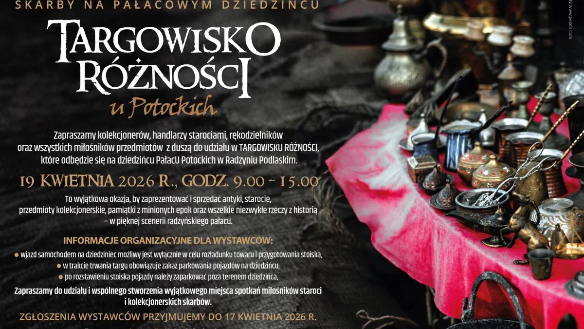 „Targowisko Różności u Potockich”, organizowane przez Radzyński Ośrodek Kultury, to propozycja zarówno dla tych, którzy lubią polować na wyjątkowe okazje, jak i dla osób szukających oryginalnych dekoracji czy prezentów. Jak zapowiadają organizatorzy, nie zabraknie przedmiotów „z duszą” – takich, które kryją za sobą historię i przyciągają niepowtarzalnym charakterem.