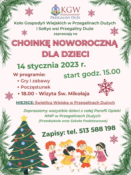 Informacje radzyńskieKoło Gospodyń Wiejskich w Przegalinach Dużych we współpracy z Sołtysem wsi zapraszają na wydarzenie, które odbędzie się w świetlicy wiejskiej w Przegalinach. Będzie to kolejna edycja noworocznej choinki dla dzieci, podczas której najmłodsi w towarzystwie swoich rówieśników spotkają Mikołaja, a także poznają wiele przygotowanych specjalnie na ten dzień zabaw.
