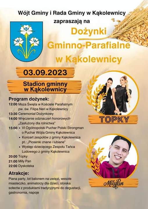 Ostatnim akordem gminno-parafialnych dożynek będą koncerty gwiazd muzyki disco. Do czerwoności publiczność rozgrzeją Topky, a o godz. 21 na scenie będziemy mogli zobaczyć Miłego Pana, który zaprezentuje swoje największe utwory, które w serwisach internetowych osiągnęły już wyniki wynoszące ponad 100 milionów wyświetleń!