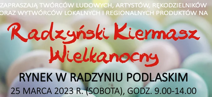 Informacje radzyńskieMiasto Radzyń Podlaski oraz Radzyński Ośrodek Kultury zapraszają na Radzyński Kiermasz Wielkanocny. Wydarzenie odbędzie się w sobotę 25 marca na Rynku w Radzyniu Podlaskim. Początek o godz. 9.00.