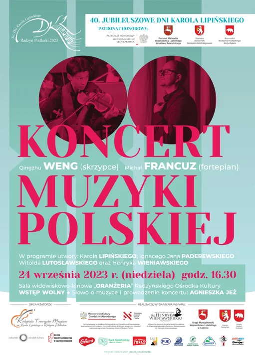 Koncert Muzyki Polskiej zainauguruje 40. Jubileuszowe Dni Karola Lipińskiego w Radzyniu Podlaskim. Kierownictwo organizacyjne objęła Agnieszka Jeż, prezes Zarządu Radzyńskiego Towarzystwa Muzycznego– głównego organizatora DKL. Współorganizatorami wydarzenia są: Radzyński Ośrodek Kultury i Miejska Biblioteka Publiczna im. Zenona Przesmyckiego w Radzyniu Podlaskim.