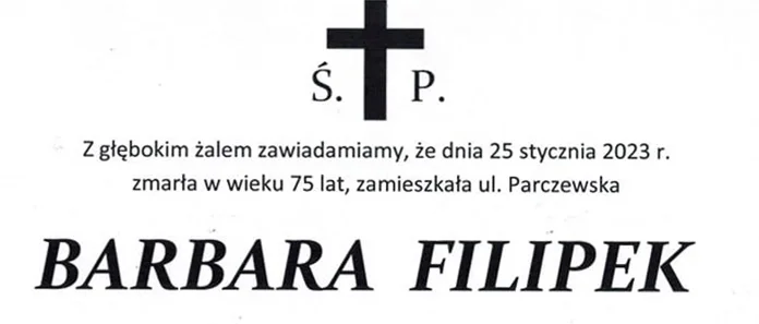 Informacje radzyńskie25 stycznia w wieku 75 lat zmarła Barbara Filipek. Mama Arkadiusza Filipka, wójta gminy Czemierniki oraz radnego Mariusza Filipka. Braciom oraz całej pogrążonej w bólu Rodzinie redakcja Wspólnoty Radzyńskiej składa wyrazy współczucia.