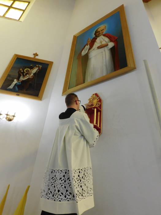 Uroczyście wniesiony relikwiarz został umieszczony pod obrazem św. Jana Pawła II.