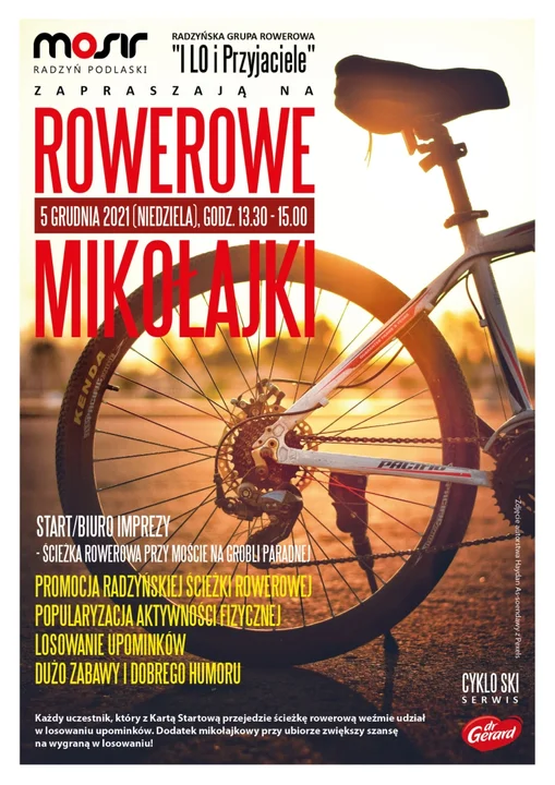 Informacje radzyńskie5 grudnia Miejski Ośrodek Sportu i Rekreacji w Radzyniu oraz Radzyńska Grupa Rowerowa I LO i Przyjaciele zapraszają wszystkich rowerzystów na Rowerowe Mikołajki. Impreza odbędzie się na ścieżce rowerowej przy moście na Grobli Paradnej. Początek o godz. 13.30. - Na uczestników czeka dużo dobrej zabawy i niespodzianki - zapowiadają organizatorzy.