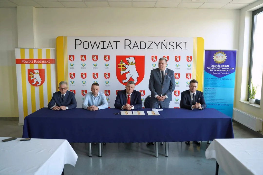 Umowę między wykonawcą a inwestorem podpisali: Starosta Radzyński Szczepan Niebrzegowski, Wicestarosta Michał Zając, Skarbnik Powiatu Radzyńskiego Marek Blicharz oraz właściciel firmy Marek Szczepaniuk, przy udziale Wicewojewody Lubelskiego Roberta Gmitruczuka. W wydarzeniu uczestniczyli również: Burmistrz Radzynia Podlaskiego Jerzy Rębek, Dyrektor ZSP Grażyna Dzida wraz z zastępcami, nauczycielami i uczniami, Przewodniczący Rady Powiatu Robert Mazurek, Członkowie Zarządu Powiatu Jerzy Bednarczyk i Witold Korulczyk oraz pracownicy Starostwa Powiatowego odpowiedzialni za realizację inwestycji.