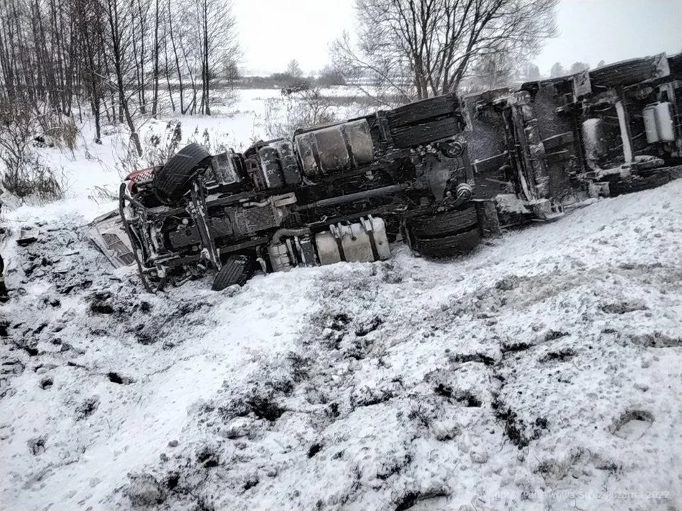 Ślisko na drodze. W Gminie Borki TIR wylądował w rowie