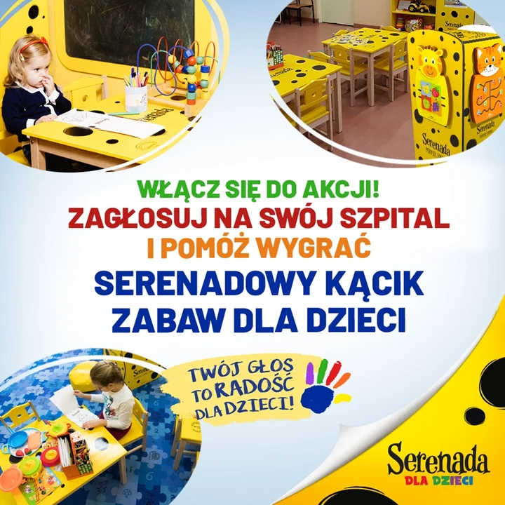 Do tegorocznej edycji Mleczarnia Spomlek wytypowała 16 szpitali w 16 miastach. 5 z nich, które w głosowaniu internetowym zdobędzie najwięcej głosów, otrzyma „Serenadowy kącik zabaw”. W jego skład wchodzą mebelki w kolorze żółtym w czarne kropki: stolik, krzesełka, regał oraz wieża z manualnymi zabawkami. Kącik wyposażony jest również w zabawki, książeczki i kolorowanki. Jest to akcja ogólnopolska, w którą chcemy zaangażować społeczność i wspólnie wybrać szpitale, gdzie urządzimy miejsca zabaw dla dzieci. Zdajemy sobie sprawę, że Covid przyczynił się do obaw rodziców i zarządów szpitali czy takie miejsca zabaw powinny być otwarte. Wiemy też, że w kilku placówkach na chwilę obecną ich nie ma. Natomiast mocno wierzymy, że epidemia minie, wrócimy do „normalnej” rzeczywistości, a dzieci będą nadal mogły korzystać z uciech zabawy. Ich zdrowie często wynika również z ich dobrego samopoczucia, a zabawa to umożliwia. Jest to przecież niezbędny element rozwoju dziecka, który uczy, rozwija i rozładowuje napięcie – mówi Aneta Mostowiec, Rzecznik prasowy SM Spomlek. Głosowanie na wybrane placówki potrwa od 10 do 23 stycznia na stronie internetowej dedykowanej akcji: www.serenadadladzieci.pl Wystarczy wejść na stronę, znaleźć szpital, na który chcemy oddać głos i kliknąć w serduszko. Można oddać jeden głos dziennie. Spółdzielcza Mleczarnia Spomlek to firma z ugruntowaną pozycją na rynku serów żółtych i produktów proszkowanych. Od lat angażuje się w projekty prospołeczne inicjując jednocześnie wiele działań. Jedną ze sztandarowych akcji jest „Serenada dla dzieci”, która promuje wśród najmłodszych zdrowy styl odżywiania jednocześnie dając dzieciom radość.