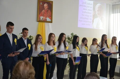 Nawiązując do hasła Dnia Papieskiego ks. dr Grzegorz Stolarski wygłosił konferencję „Służyć we wzrastaniu w prawdzie i miłości.” Po wysłuchaniu konferencji uczestnicy spotkania i zaproszeni goście podzielili się własnymi doświadczeniami i przemyśleniami związanymi z realizacją zadań wychowawczych wynikających z przesłania jakie pozostawił nam św. Jan Paweł II. W dalszej części uczniowie w montażu słowno-muzycznym zaprezentowali treści zawarte w encyklice Jana Pawła II „Veritatis splendor”. Spotkanie zakończyło się poczęstunkiem przygotowanym przez uczniów klas gastronomicznych pod kierunkiem nauczycieli gastronomii.